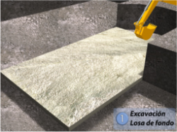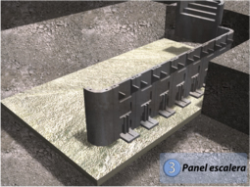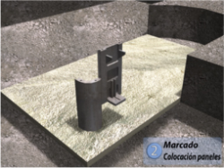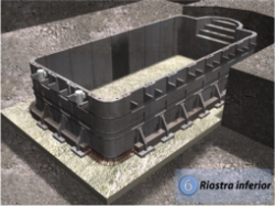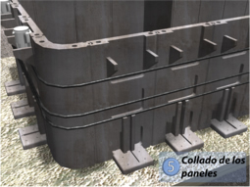 Riostras perimetrales de atado y coronación: se disponen las armaduras de la riostra de atado inferior. Se colocan los contrafuertes de todos los paneles. Se hormigona el zuncho de atado. Durante el tiempo de secado se realizan los trabajos de conexión de los elementos del sistema de filtración y otros, colocando los tubos y cables sobre los soportes que presentan los paneles. Conexionado de todos los paneles a la toma de tierra. Tras lo cual se rellena la zanja hasta la altura de la mensula de apoyo de la riostra superior con grava compactada. Y se colocan las armaduras y el encofrado de la riostra superior para su hormigonado.