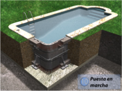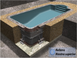Fabricación de la losa de fondo: se encofra, arma y hormigona la losa de fondo según características e indicaciones del proyecto entregado con la piscina. Se disponen en ella los elementos de la filtración (sumideros) y otros sistemas según modelo y complementos seleccionados (boquillas impulsoras de fondo, …). El desnivel máximo admisible será de ± 1 cm en toda la superficie.