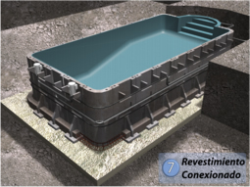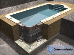 Finalmente se realiza el coronamiento con brocales o bien por moldeo continuo in situ, y se procede a la colocación del revestimiento elegido por el cliente (revestimiento cerámico, vítreo o liner).Para finalizar se instala el local técnico y se realiza el conexionado a las conducciones hidráulicas y eléctricas de la piscina y las de acometida y desagüe.